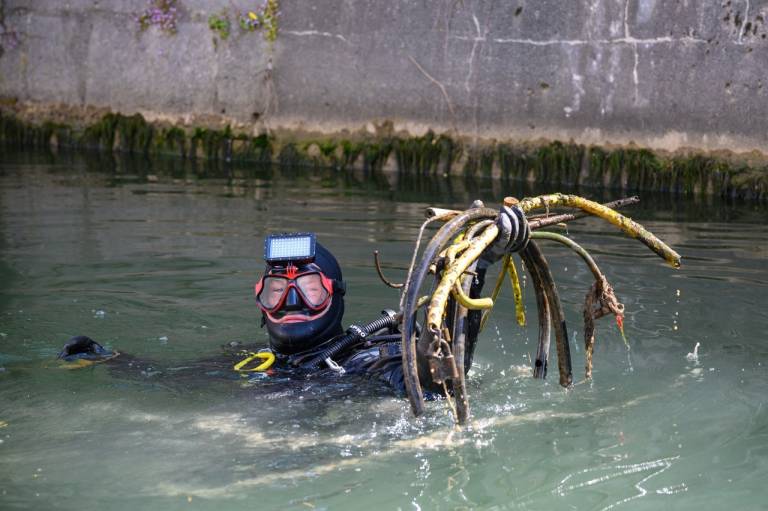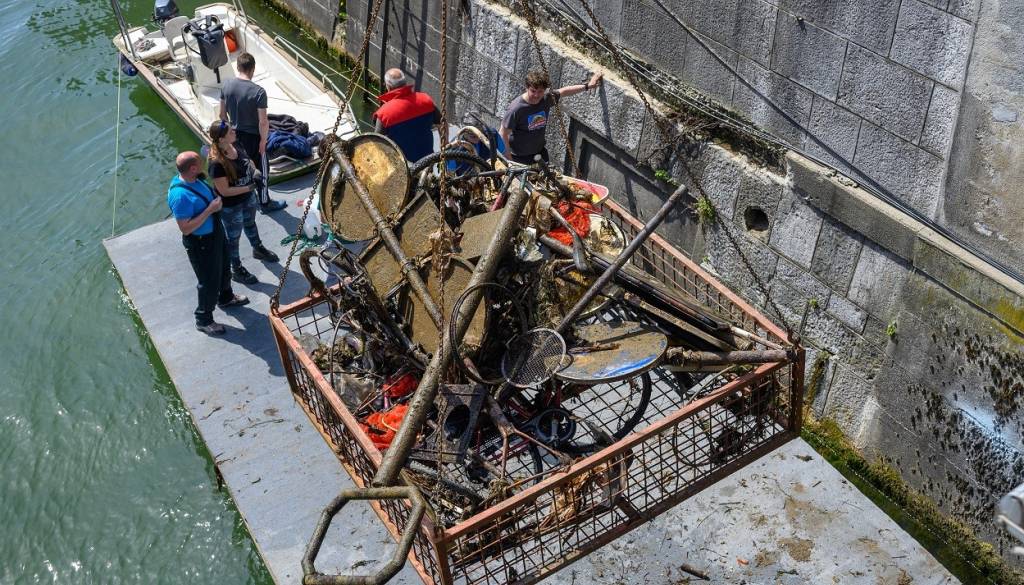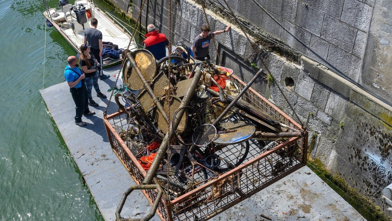 Pri tem so iz nje potegnili za skoraj tono odpadkov, med katerimi so se znašla denimo motorna kolesa, vozički in prometni znaki, ter jih postavili na ogled občanom in mimoidočim na Čevljarskem mostu.