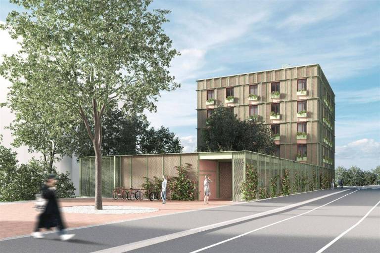 Nova stavba je zasnovana kot atrijski stolpič s petimi nadzemnimi etažami in je namenjena dolgoročni ureditvi zavetišča na tej lokaciji. Pritličje bo namenjeno razdeljevalnici hrane, sanitarijam ter prostorom za svetovanja in različne dogodke.