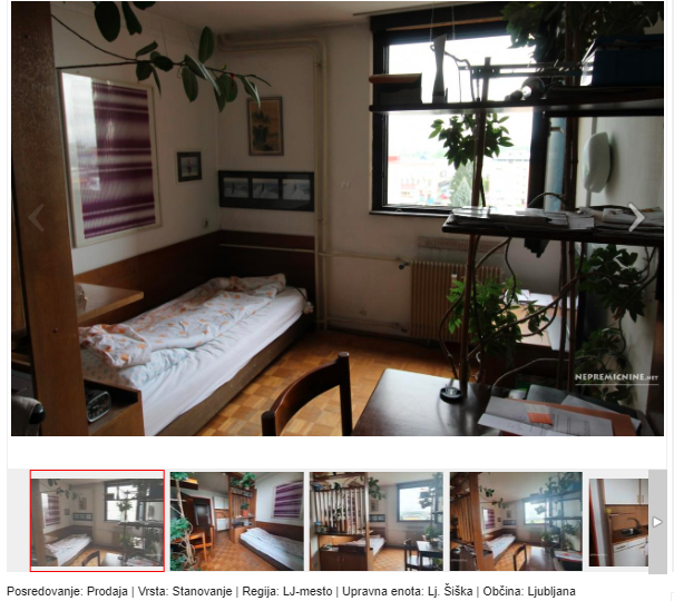 Ko smo prečesavali nepremičninski portal nepremicnine.net, smo med najcenejšimi nepremičninami v kategoriji 'stanovanja v Ljubljani' naleteli na prodajo 'sobe'. V Mostah se tako prodaja za 39 tisoč evrov soba, ki ima deset kvadratnih metrov. Fotografije ni na voljo, piše le, da je bil blok zgrajen leta 1975 in da je omenjena soba v pritličju štirinadstropnega bloka.