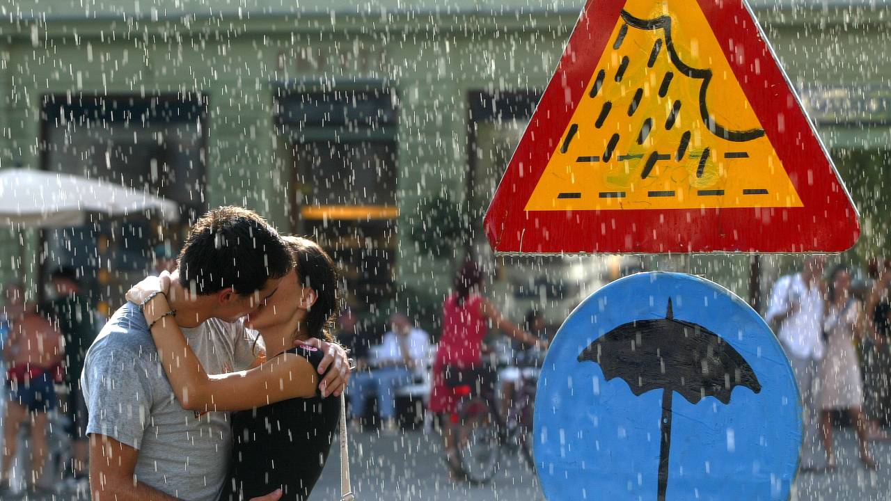 Prometni znaki, ki z umetniškim pridihom opozarjajo na dež, in igriv napis »Območje z lastnim vremenom« sta že skoraj kultna.