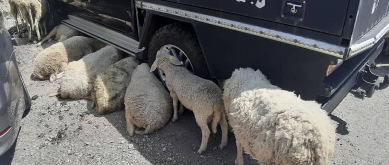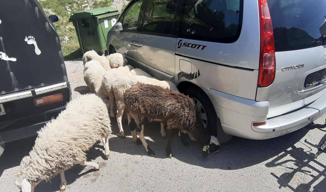 Pozornost enega od obiskovalcev so na Vršiču v zadnjih dneh pritegnile ovce, ki se stiskajo ob parkirane avtomobile.