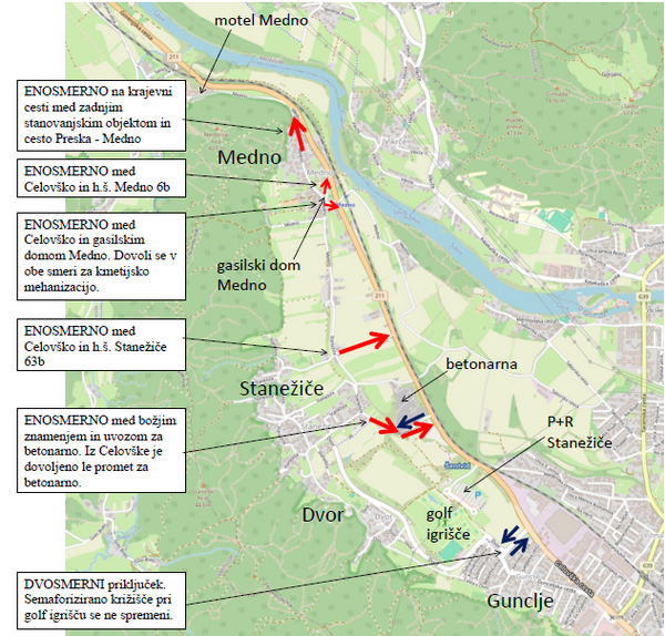 Tako je po novem na vseh priključkih v Mednem in Stanežičah urejen enosmerni promet v smeri priključevanja na Celovško cesto. Pri gasilskem domu Medno je dovoljena vožnja kmetijski mehanizaciji v obe smeri.