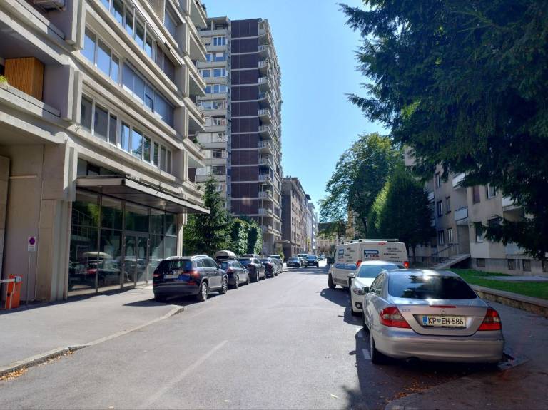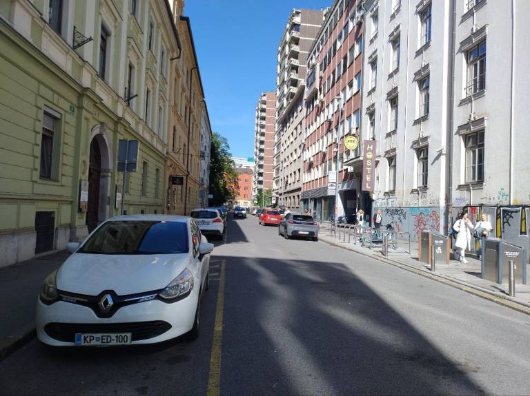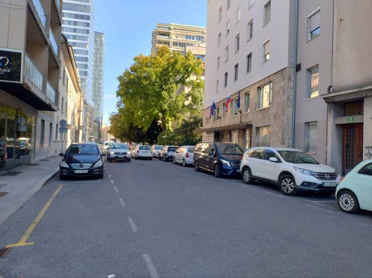 Na Slovenski ni parkirnih mest, največ jih je na Kersnikovi ulici, na Vošnjakovi sta le dve, saj so vsa ostala rezervirana za hotel Lev in tamkajšnji hostel, na Dvorakovi pa jih je res malo, dve pa sta rezervirani za ambasado Kosova, povsod pa so prazna parkirna mesta za električne avtomobile.