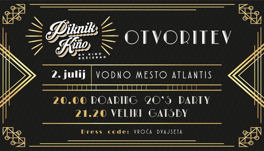 Vodno mesto Atlantis v velikem slogu nocoj ob 20. uri odpira Piknik Kino! Pridite na večer živahnega charlestona, hladnega šampanjca, blišča in perja, ki se bo ob 21. uri in 20 minut zaključil z ogledom z oskarjem nagrajenega Velikega Gatsbyja. Dress code: vroča dvajseta!