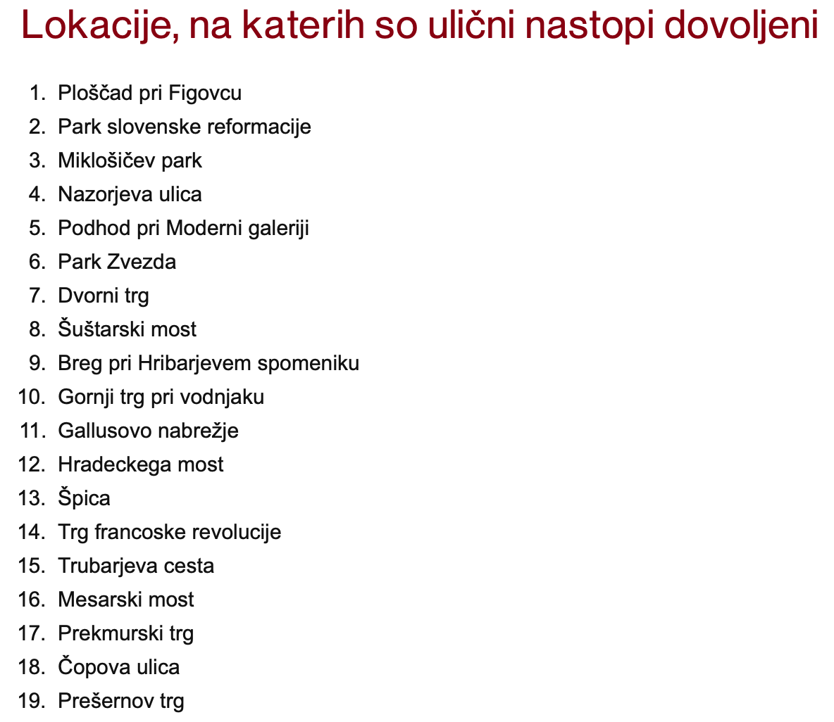 »Dovoljenja za rabo javne površine se izdajajo le za izvedbo javnih prireditev in to na podlagi vloge organizatorja. Ulični nastopajoči ne potrebujejo dovoljenja MOL, morajo pa v celoti upoštevati odlok o posebni rabi javnih površin, kar nadzira pristojni inšpekcijski organ MOL.«