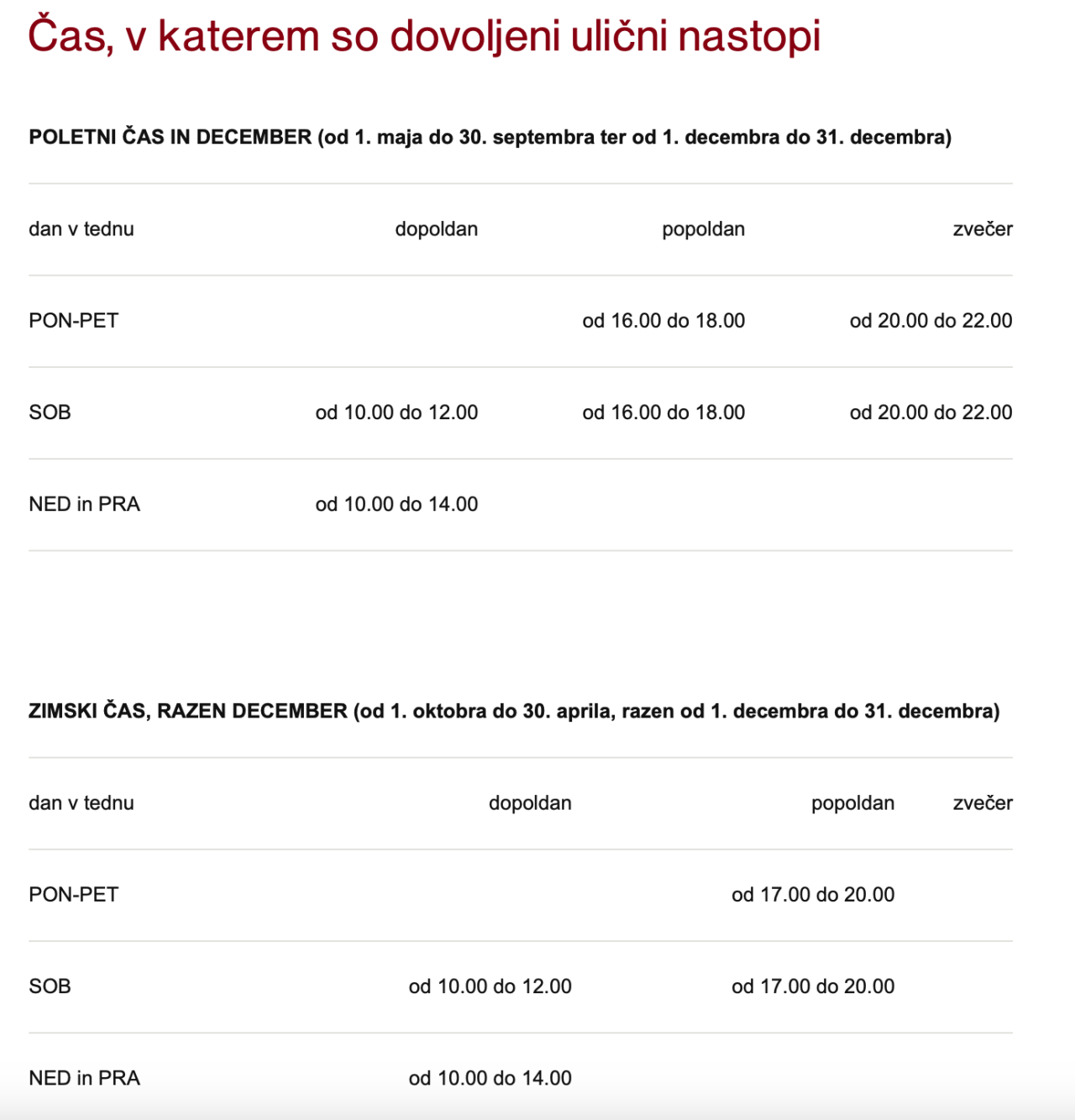 Določen je tudi prav poseben urnik s termini, ko je dovoljeno izvajanje uličnih nastopov: