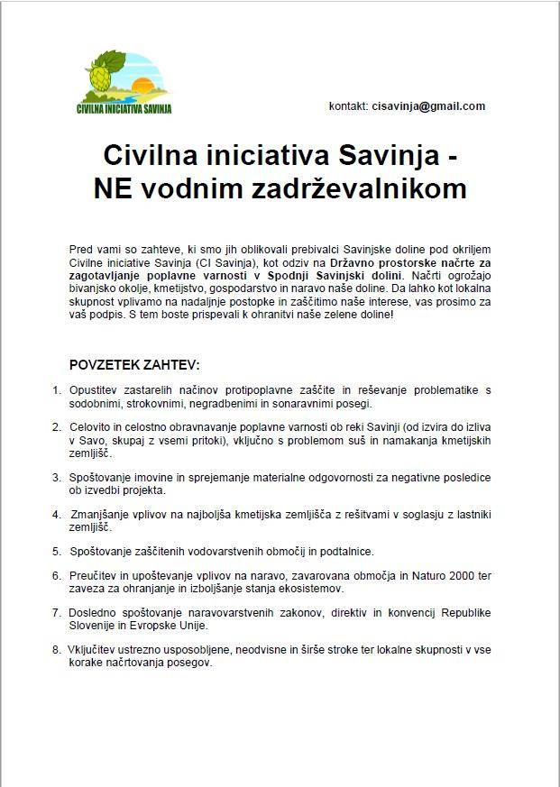 V Civilni iniciativi Savinja ob tem poudarjajo, da nikakor niso proti poplavnim ukrepom, želijo pa si, da se jih izvaja smiselno in bolj učinkovito ter z manjšimi posegi v okolje in posledično tudi ljudi.
