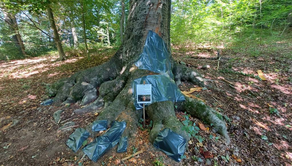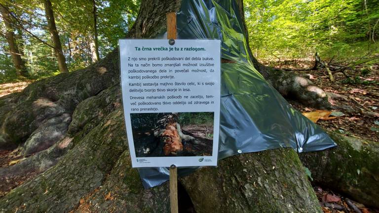 Tako so v Krajinskem parku Tivoli, Rožnik in Šišenski hrib, s črno vrečko prekrili poškodovani del debla bukve, ki je bila poškodovana v ponedeljkovem večernem neurju.