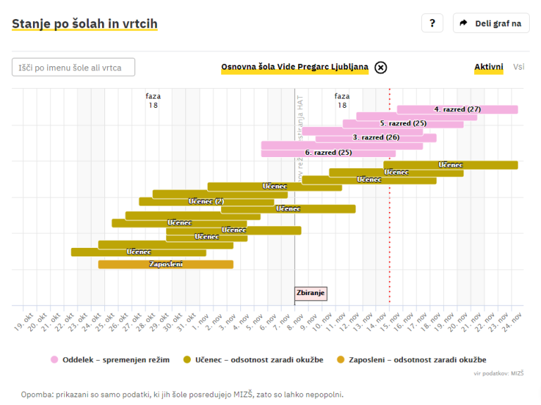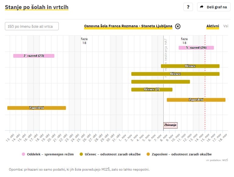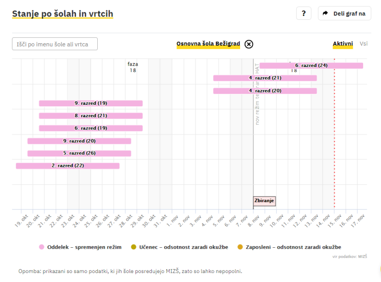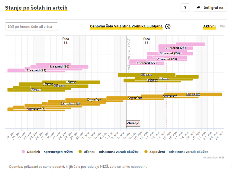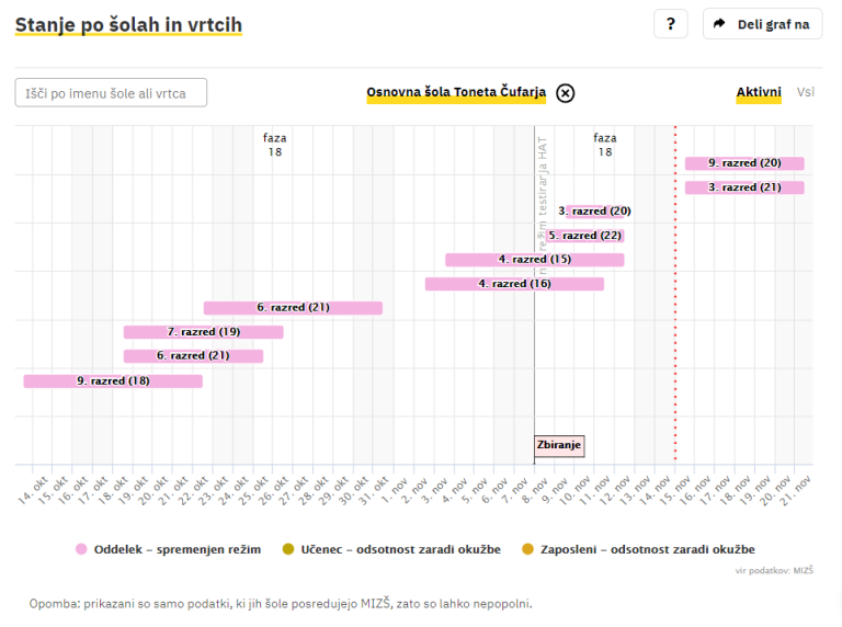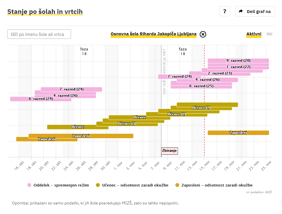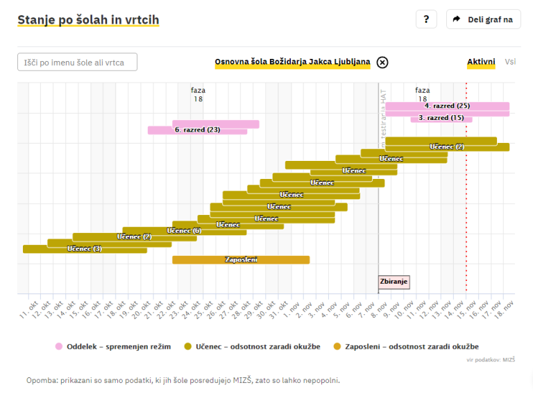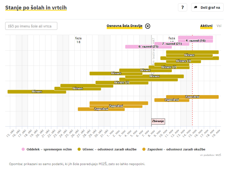 Covid-19 sledilnik redno objavlja podatke o okužbah, sumih na okužbo in karantenah v slovenskih osnovnih in srednjih šolah ter vrtcih. Izpostavljamo ljubljanske šole, pri katerih so v karanteni celotni oddelki, pouk pa poteka na daljavo.