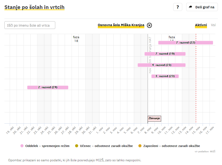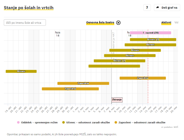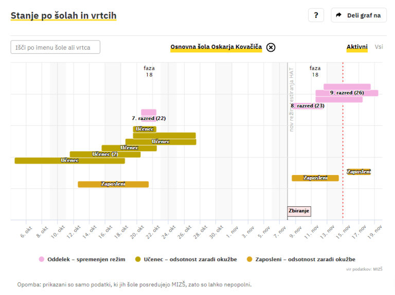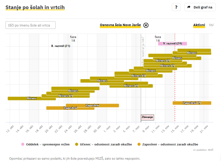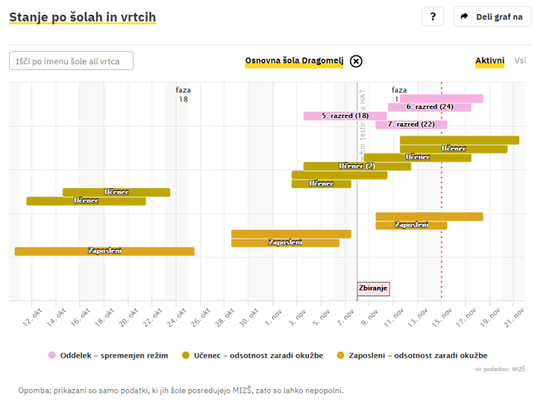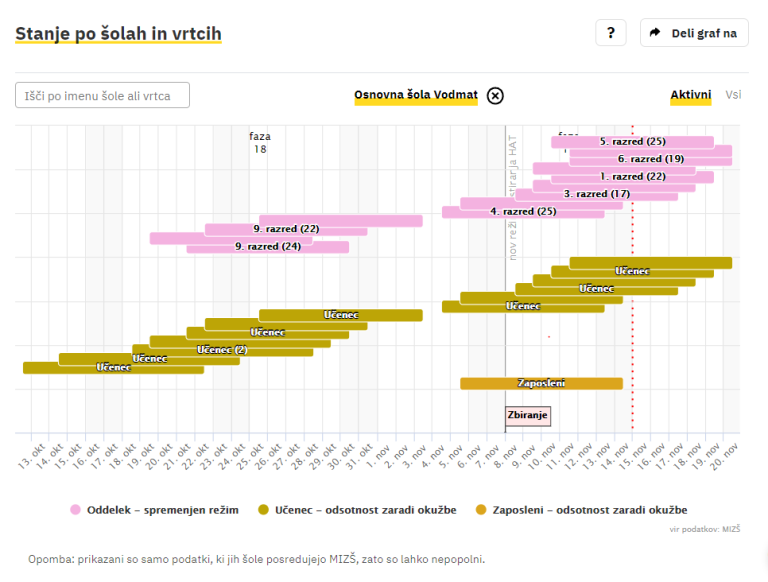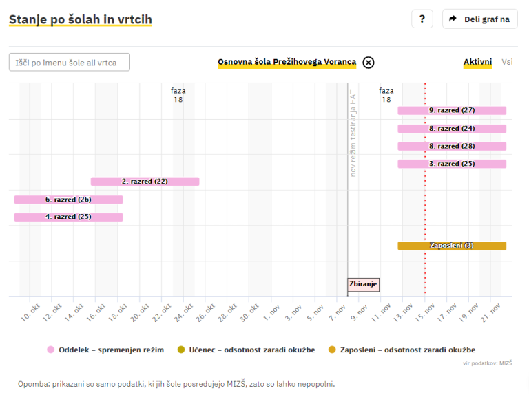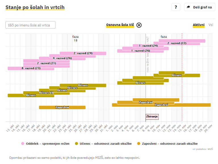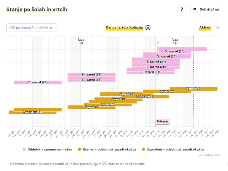 Covid-19 sledilnik redno objavlja podatke o okužbah, sumih na okužbo in karantenah v slovenskih osnovnih in srednjih šolah ter vrtcih. Izpostavljamo ljubljanske šole, pri katerih so v karanteni celotni oddelki, pouk pa poteka na daljavo.