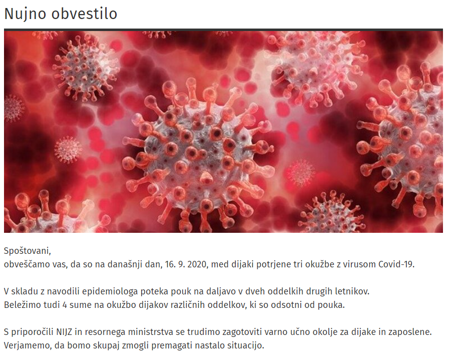 "Od nedelje do danes smo v CIRIUS-u zabeležili 4 okužbe, in sicer 2 med dijaki in 2 med zaposlenimi. Smo v stalnih stikih z NZJZ-jem, kjer so odredili karanteno za 30 otrok in 7 zaposlenih." je dejal ravnatelj Ciriusa Goran Pavlič.