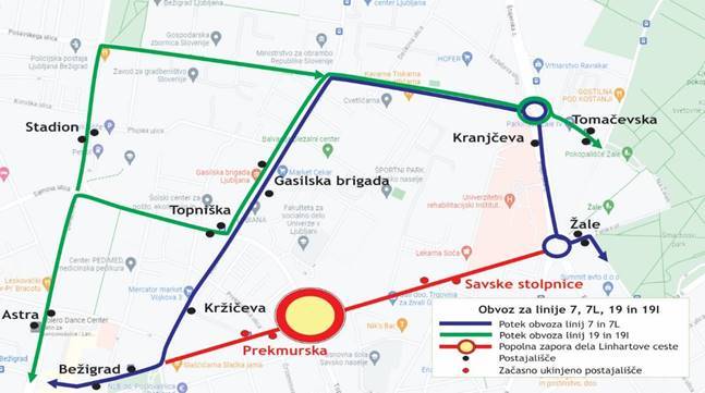 Po obvozu bodo vozili tudi avtobusi LPP. Spremenjene trase so označene na skici.