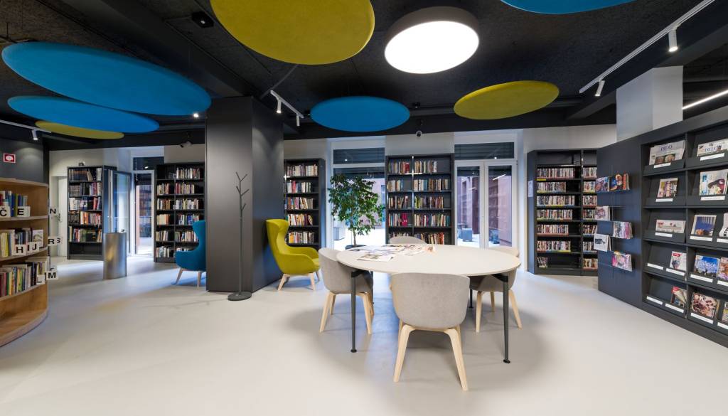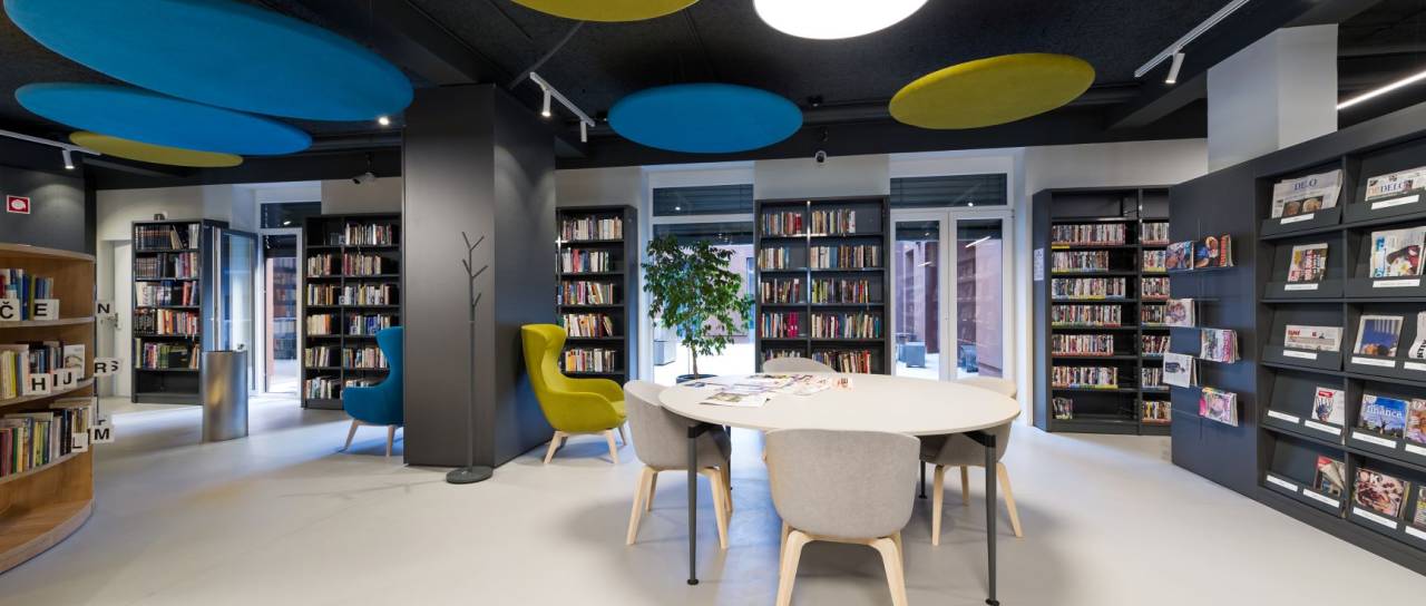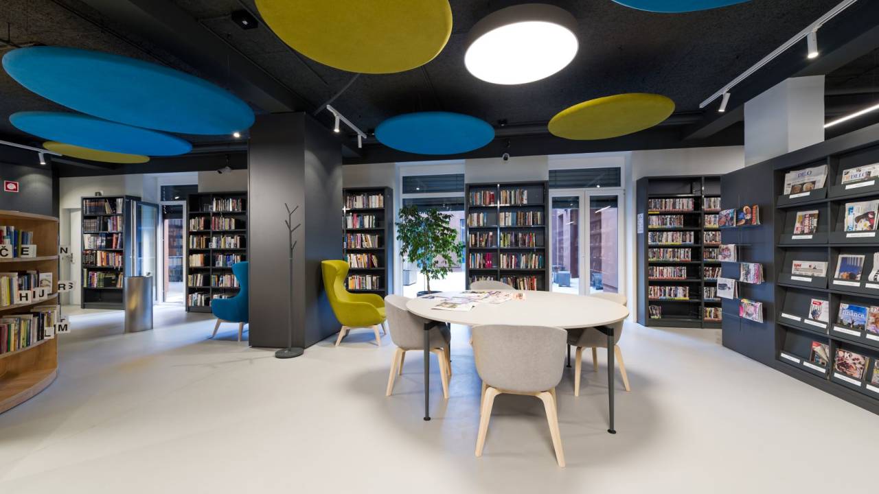 Nova zasnova prostorov knjižnice, ki je umeščena v pritličje stavbe, je dinamična in odprta, zato je lahko dostopna gibalno oviranim prebivalcem ter osebam z vozički.