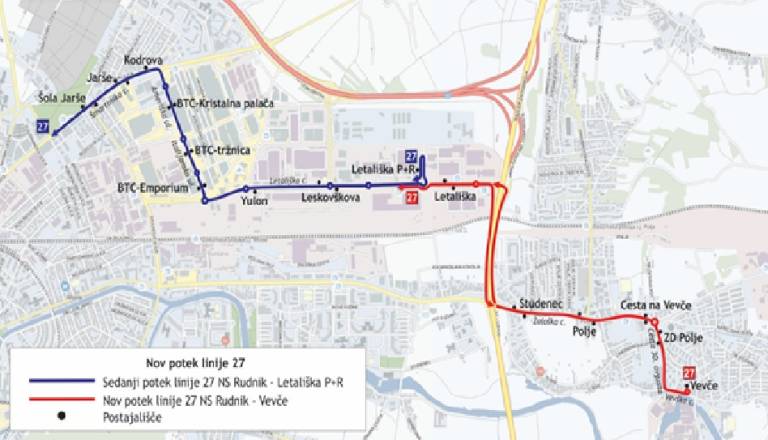 Trenutno linija 27 vozi na relaciji NS Rudnik – BTC City – P+R Letališka, po novem pa bo potekala od NS Rudnik, skozi BTC City, po Letališki cesti in čez Polje do končnega postajališča v Vevčah.