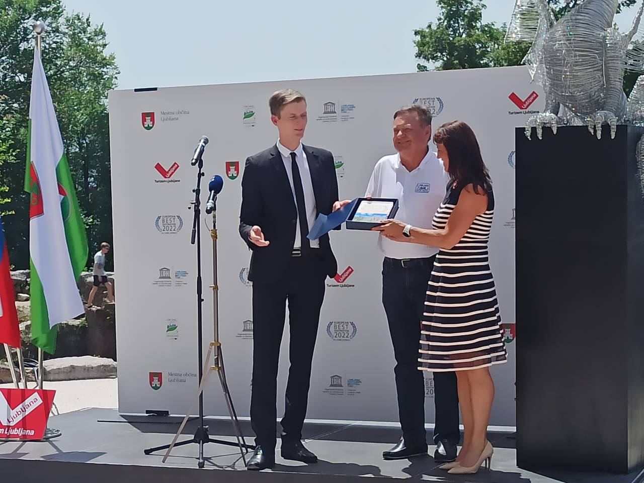 Maximilien Dejeune, direktor organizacije European Best Destinations, je ljubljanskemu županu Zoranu Jankoviću predal nagrado in v govoru povedal: