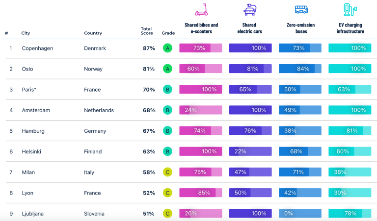 Znani so rezultati raziskave organizacije Clean Cities, ki je razvrstila 42 večjih mest Evrope po štirih kategorijah: dostopnost infrastrukture koles ter e-skuterjev v skupni rabi, avtomobilov v skupni rabi, brezemisijskih avtobusov ter polnilnic za električna vozila.
