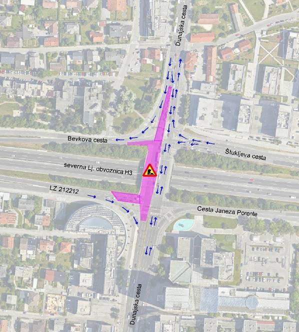 Zavijanje iz Dunajske ceste levo na Bevkovo ulico ne bo možno, prav tako ne bo možna vožnja iz Štukljeve ceste na Bevkovo cesto in iz ceste LZ 212212 levo proti Ježici in naravnost na Cesto Janeza Porente.