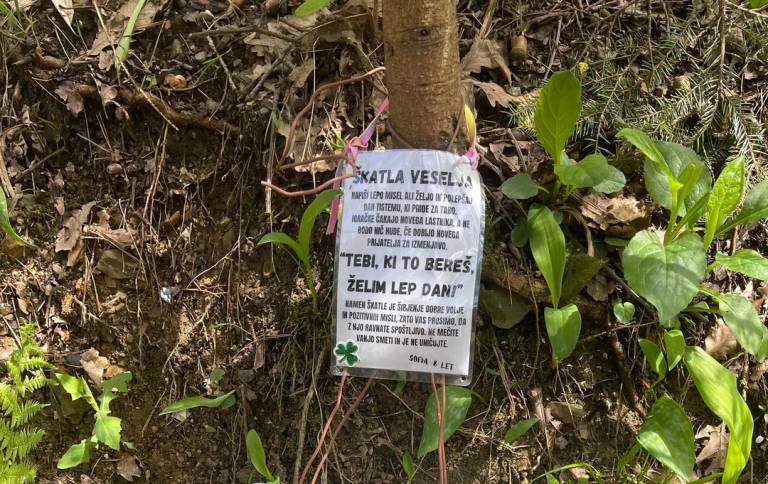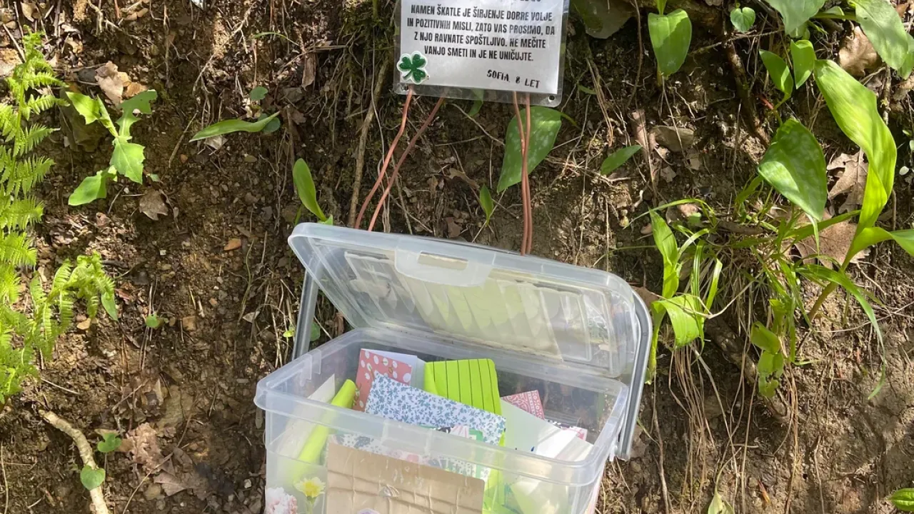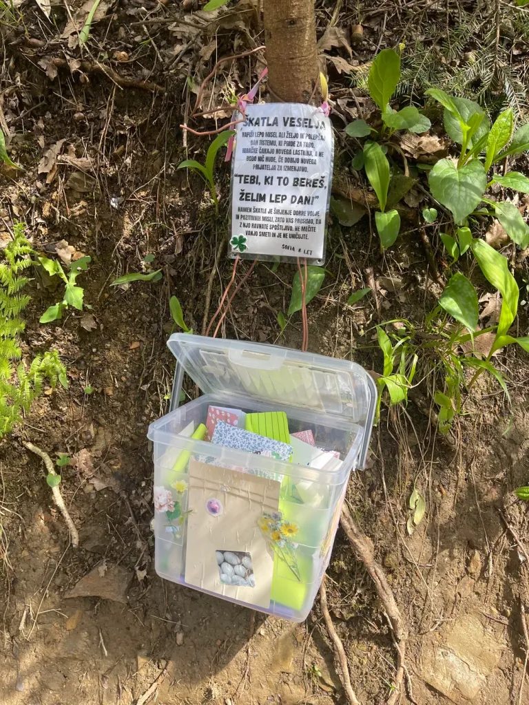 Sredi gozdička v Krajinskem parku Tivoli, Rožnik in Šišenski hrib je namreč sprehajalec oziroma sprehajalka našla prav posebno škatlico. Na njej piše Škatla veselja.