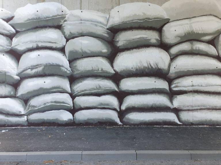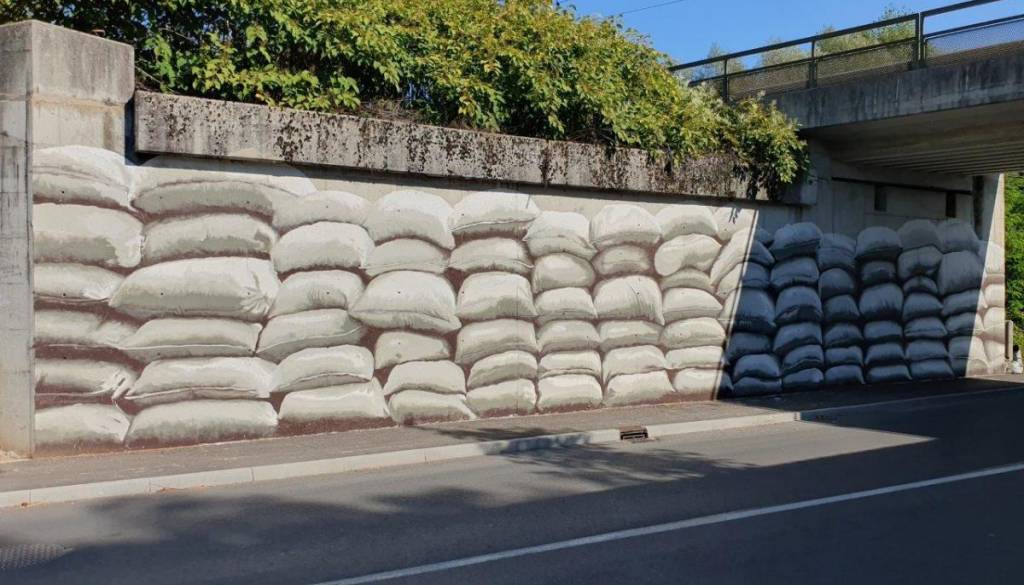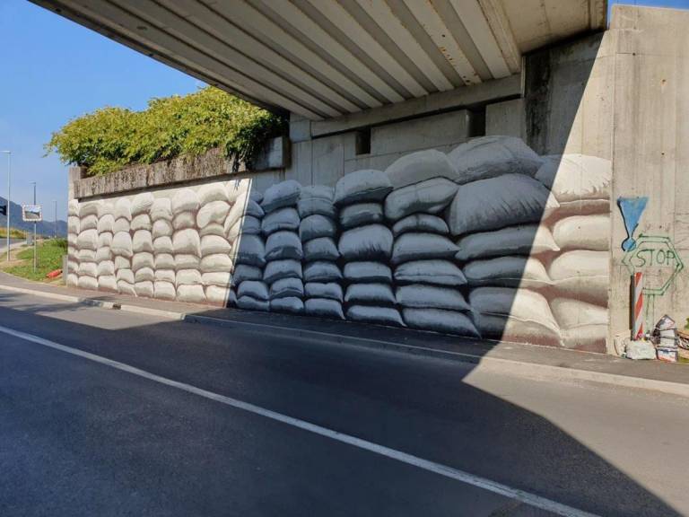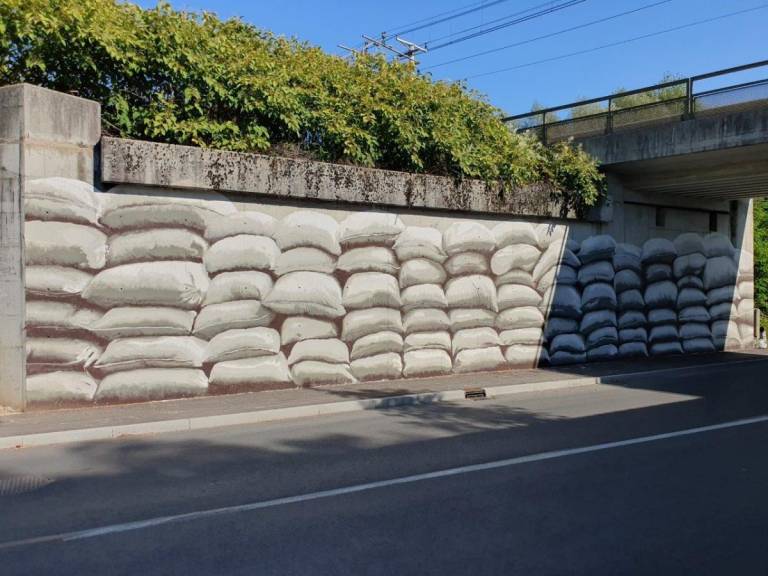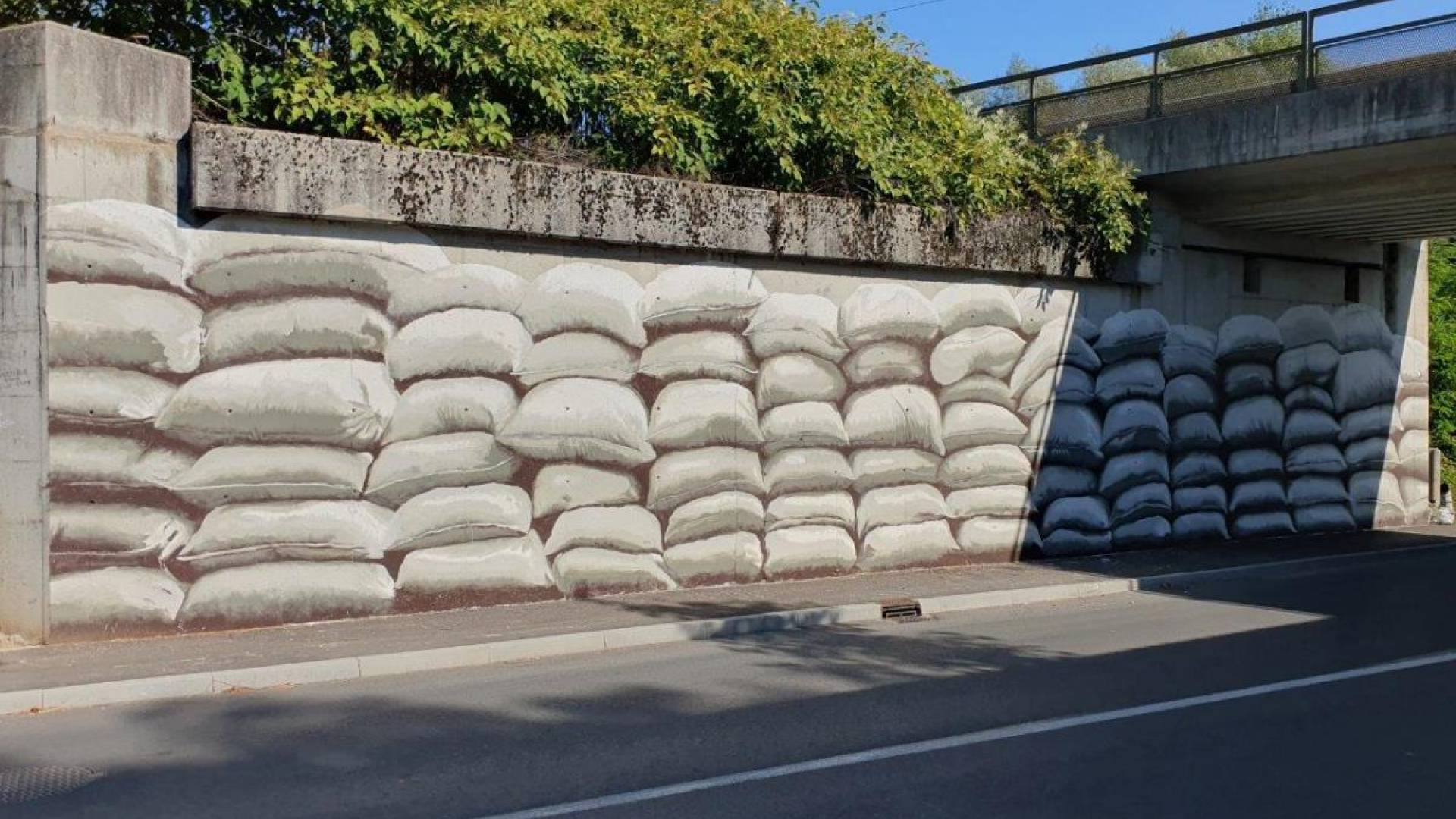 Mednarodno priznani grafitar s psevdonimom NAME: je na delu podvoza upodobil protipoplavne vreče, ki opominjajo na to, da je motorni promet eden večjih povzročiteljev podnebnih sprememb, ki se kažejo v uničujočih vremenskih ujmah.