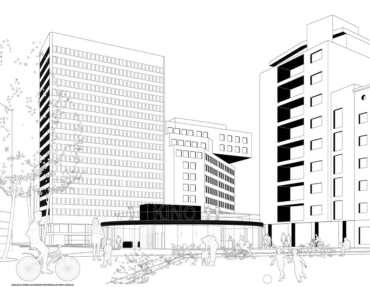 Tam naj bi bile tri manjše kinodvorane in dve večji, nad podhodom (torej pri Gostilni Figovec, tam stoji še trafika in nekaj klopi, blizu pa je Argentinski park oziroma Park slovenske reformacije) pa predvidevajo postavitev paviljona.