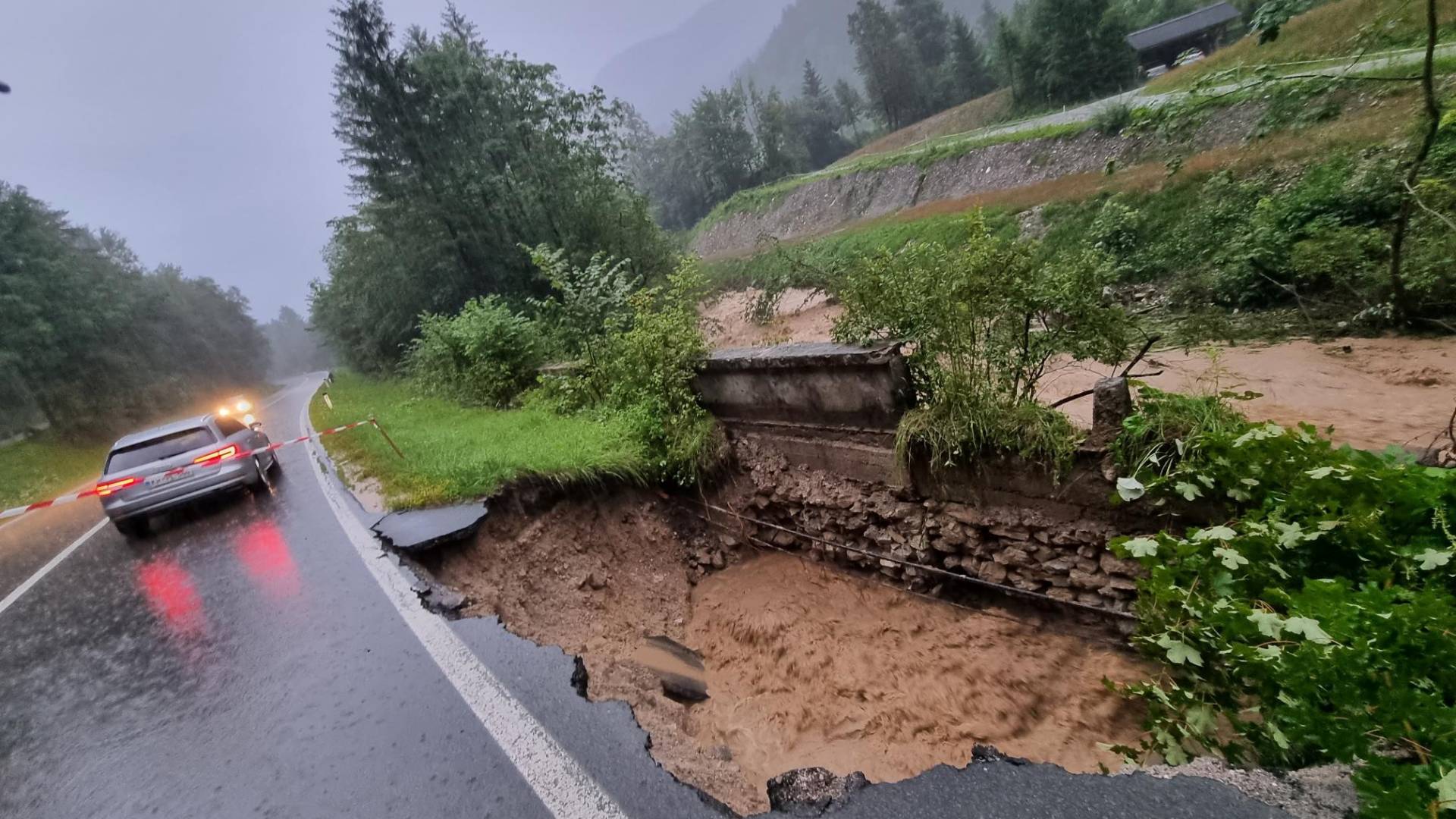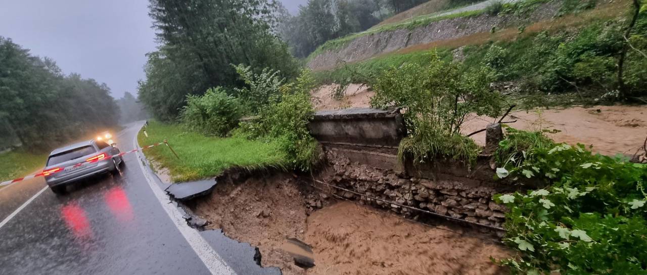 Na območju severne in osrednje Slovenije je kot posledica prehoda nevihtne fronte močno deževje povzročilo tudi poškodbe na cestah.