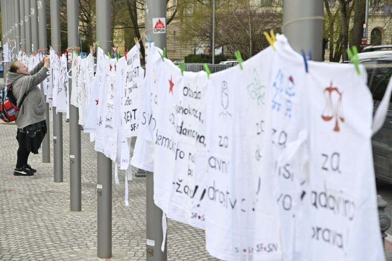 Na protestu so javno razstavili tudi unikatne primere transparentov, ki sta jih tekom protestov oblikovala protestnik in protestnica, in sicer kar na kuhinjskih predpasnikih.