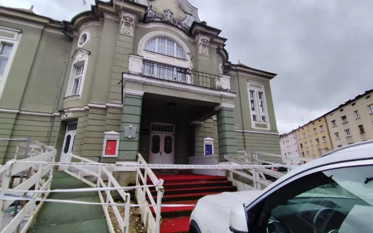Okoli stavbe je postavljena jeklena ograja, pred njo pa na gosto parkirani avtomobili. Tako je že vse od lanske jeseni.