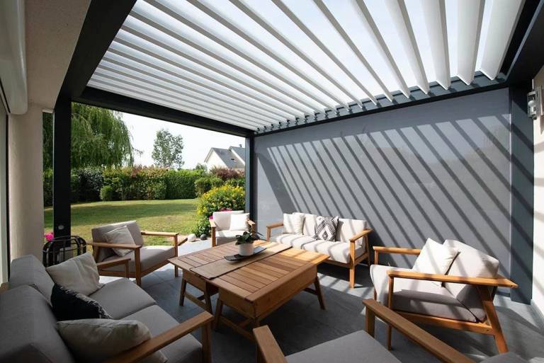 Skorajda vse najbolj kakovostne pergole imajo danes prilagodljivo streho. To pomeni, da imajo premične in vrtljive lamele, ki omogočajo individualno prilagajanje senčenja glede na vremenske razmere.