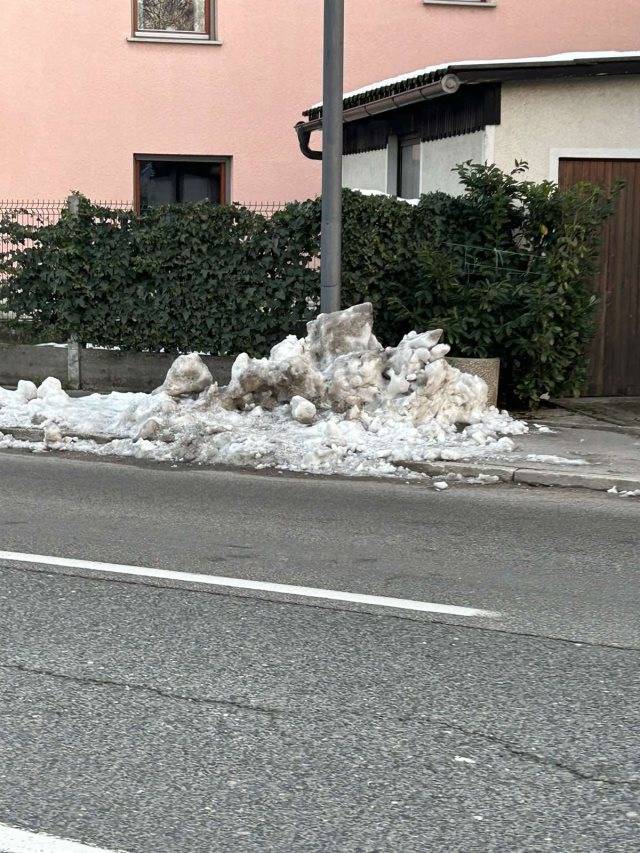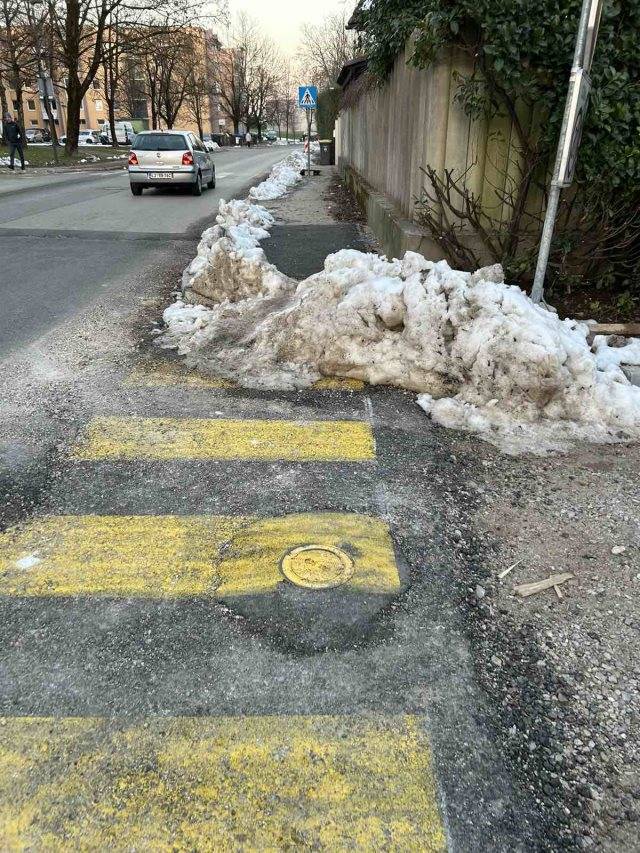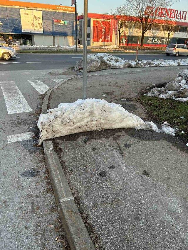 »Prilagam dve fotografiji neprehodnih pločnikov v Dravljah. Vsi se strinjamo, da smo zadnji v vrsti zaradi degradiranega okoliša, vseeno pa prosimo, ker tudi plačujemo prispevke, da bi se vsaj teden, dva ali tri po sneženju očistilo pločnike. Praktično ni prehoda ali pločnika, kjer ne bi bili kupi snega. Prosim da uredite do konca tedna, lokacij s kupi snega je nešteto. Hvala.«