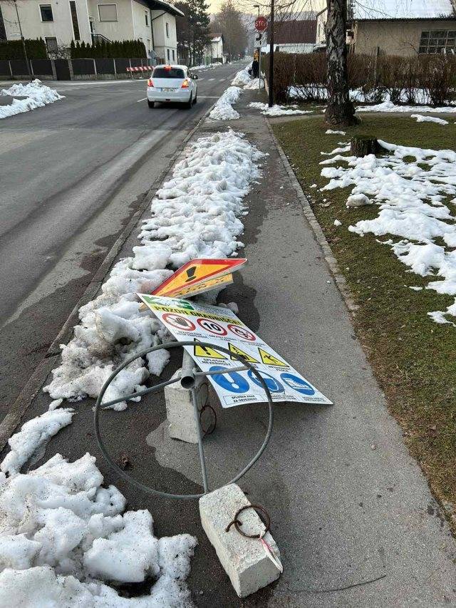 »Neočiščen pločnik, table ležijo po tleh že dva meseca. Kdo mora to urediti?«