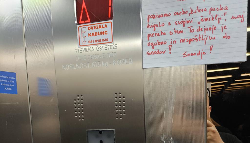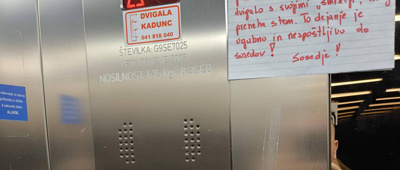 V dvigalu se namreč večkrat pojavljajo madeži smrkljev, kar je med sosedi sprožilo nelagodje in vprašanja, kako se lotiti reševanja težave.