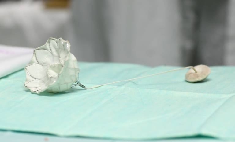 Kardiokirurginja Univerzitetnega kliničnega centra Ljubljana Tadeja Kolar je dodala, da je ob razpiranju zaklopke v srcu pomembno, da jo s čepkom na vrvici, ki je nanjo pritrjena, pravilno prilagodimo.