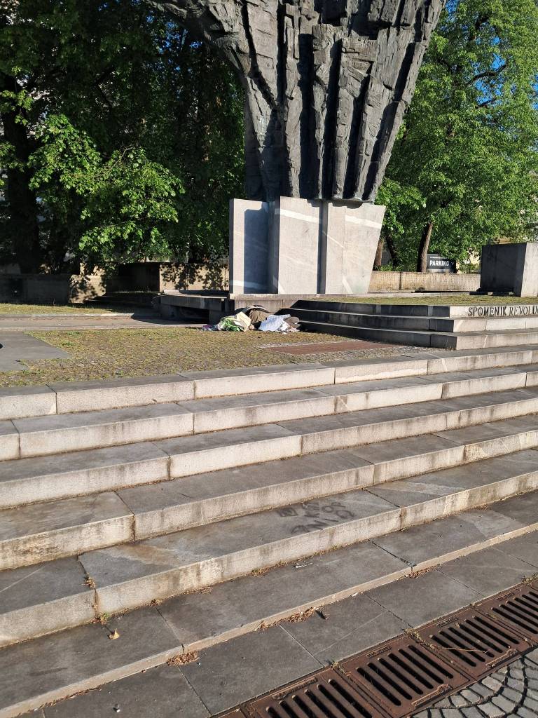 Spomenik revolucije, monumentalno delo kiparja Draga Tršarja, predstavlja eno najbolj prepoznavnih točk trga in prostor, kjer se odvijajo državne slovesnosti, protesti in javni dogodki. Tokrat pa je postal kulisa za povsem drugačno realnost Ljubljane - realnost, ki ni vedno vidna, a je vse bolj prisotna.