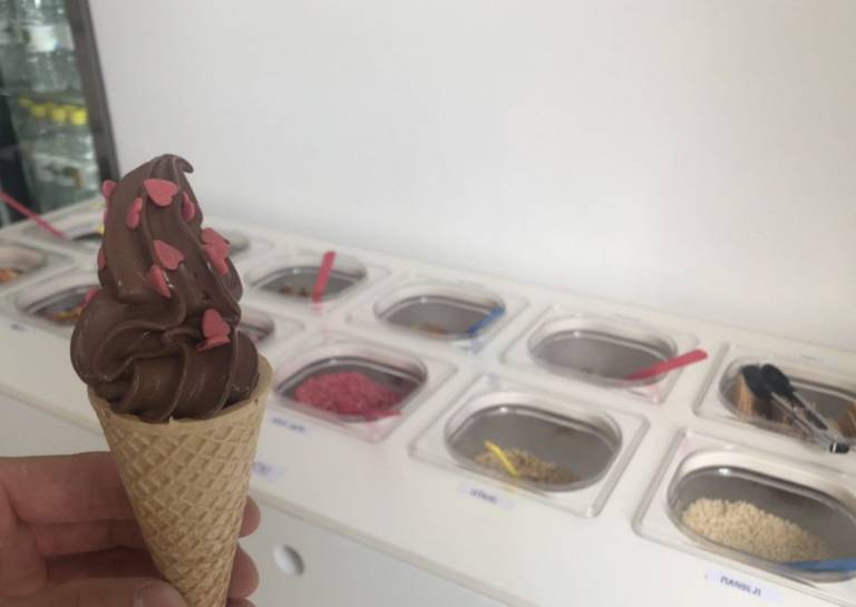 Na izbran okus ali kombinacijo okusov nato posujete dodatke. Izbirate lahko med 32 različnimi posipi, prelivi, sadjem in mrvicami.
