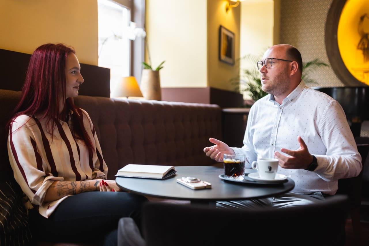 Tako je bolj sproščeno, meni, saj pogovor ne poteka preko njegove pisalne mize, ampak prijateljsko, lahkotno, ob kavi. Ob rokovanju z nasmehom predlaga tikanje - tako bo pogovor lažje stekel.