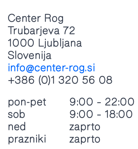 »Center Rog je sodoben izdelovalniški prostor, namenjen vsem, ki radi ustvarjajo z rokami, ne glede na znanje in starost. V Centru Rog je tudi devetnajst projektnih studiev in pet rezidenčnih stanovanj, poleg tega pa še enota Mestne knjižnice Ljubljana, knjižnica Rog, velika razstavno-prireditvena dvorana, kavarna, bistro in restavracija ter več trgovin z lokalnimi izdelki. Pred Centrom Rog je velik javni park, v udobno opremljenih drop-in kotičkih v vseh nadstropjih pa lahko kadarkoli počivaš, delaš ali se družiš,« lahko preberemo na uradni predstavitveni strani centra.