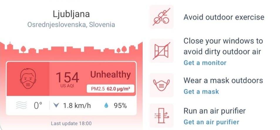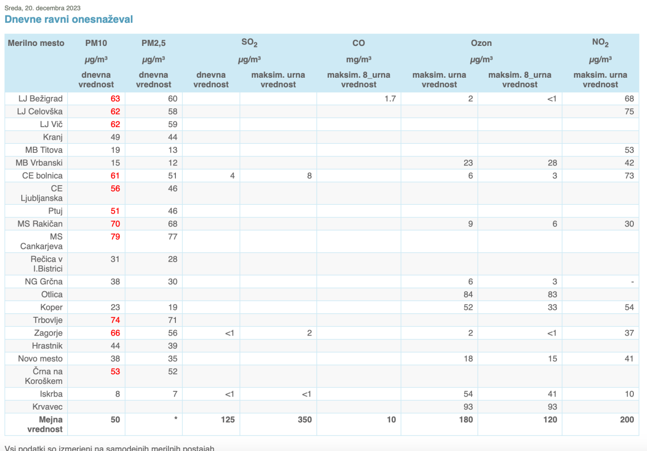 Podatki Agencije Republike Slovenije za okolje in prostor o podobni situaciji pričajo tudi danes - vsebnost delcev je bila zabeležena kot previsoka na vseh treh ljubljanskih merilnih postajah, hkrati pa so številke v rdečem tudi po nekaterih drugih slovenskih občinah, pa posebej v kotlinah.