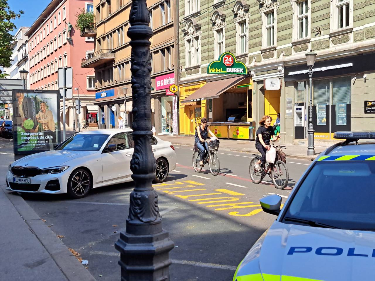 Občan se je na pobudah meščanov pritožil glede obratovanja Nobel bureka, prav tako ne razume, kako je lahko dovoljeno, da se prodajalna oglašuje čez celotno Miklošičevo cesto.