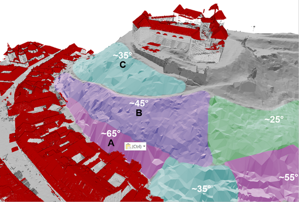 Na Grajskem griču so določili tri erozijske stopnje: C z naklonom približno 35 stopinj; B z naklonom približno 45 stopinj; in A s (kritičnim) naklonom 65 stopinj. Na tem območju so pečine, visoke do 25 metrov; podori in erozija sta tu stalnica.