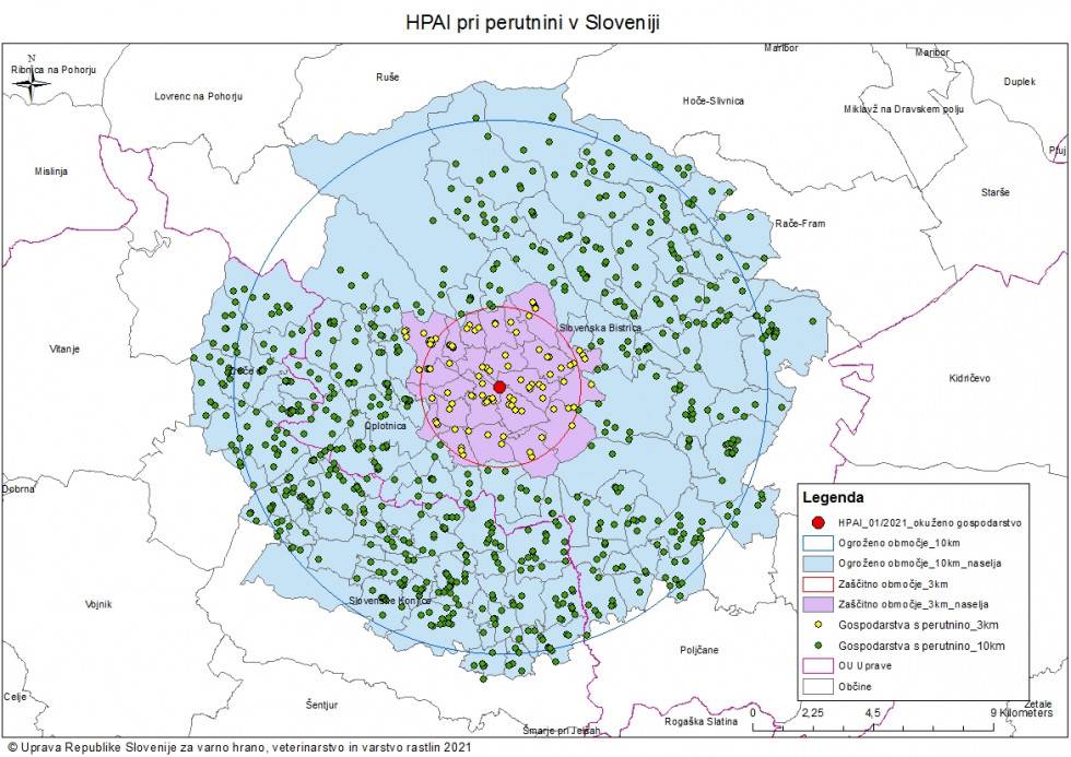 Prvi primer aviarne influence pri domači perutnini je bil potrjen na manjšem gospodarstvu na območju občine Slovenska Bistrica. Sum je postavil veterinar praktik na podlagi prijave imetnika o povečanem poginu perutnine. Na gospodarstvu so bile poleg kokoši še race in gosi.
