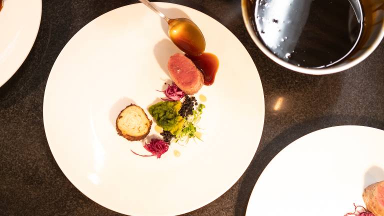 Lejla Avmedoski in Nejc Bizjak pa sta ustvarila srnin hrbet s skutnim štrukljem s pehtranom, kostanjevo peno, omako z medico in jabolčnim gelom.
