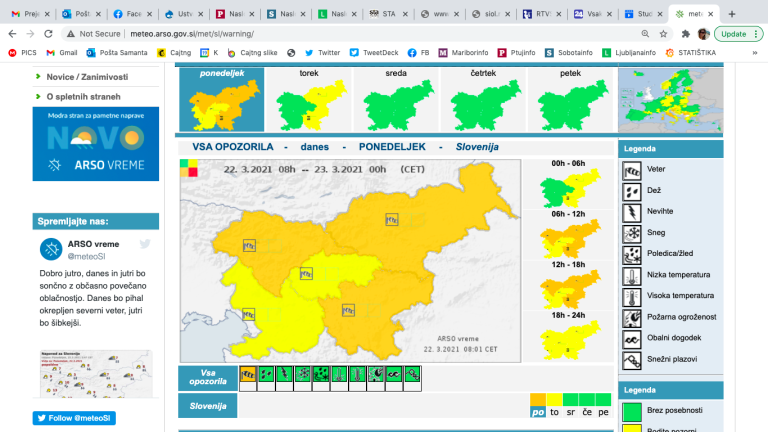 Okrepljen severni veter bo najbolj izrazit pod Karavankami in v vzhodni Sloveniji. Najmočnejši sunki bodo med 70 in 80 kilometri na uro. Agencija Republike Slovenije za okolje je že izdala opozorilo.