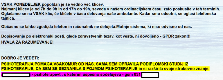 Na koncu obvestila pa je objavila še osebno pripombo o psihoterapiji in navedla kontakt zunanjega psihoterapevta, s katerim sodeluje.