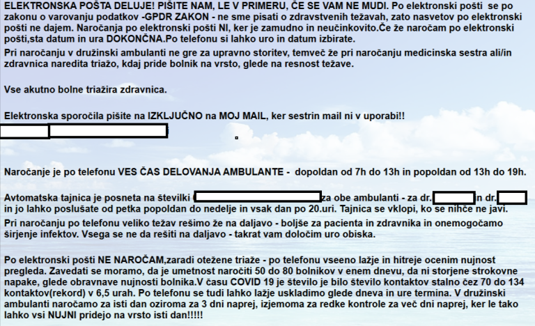 Nadalje je v zvezi z zapisom na spletni strani zdravstvenega doma povedala, da ima elektronska komunikacija svoje mesto v medicini, vendar je v družinski medicini lahko zelo nevarna.