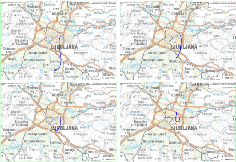 Posredovali so tudi karto, ki prikazuje potovanje zračne mase pri tleh od požara (rdeč križec) pri različnih začetnih časih (14. december ob 12., 14., 16. in 18. uri). Križci na modrih črtah prikazujejo lokacijo zraka za vsako nadaljnjo uro.