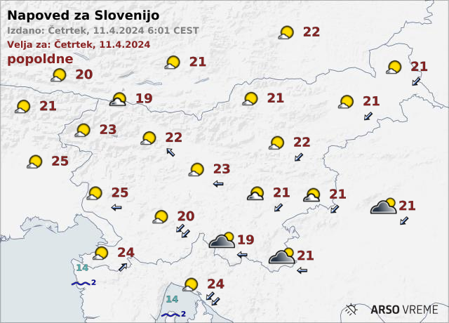 Najvišje dnevne temperature bodo od 19 do 23, na Primorskem do 25 stopinj Celzija.