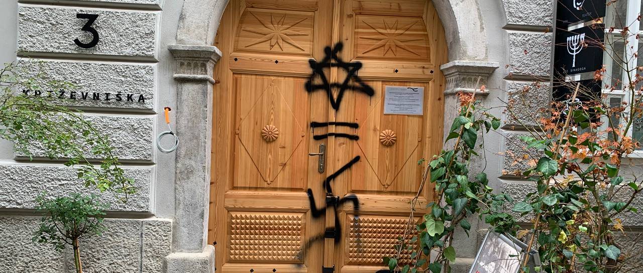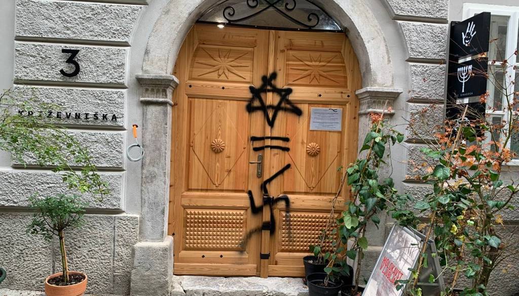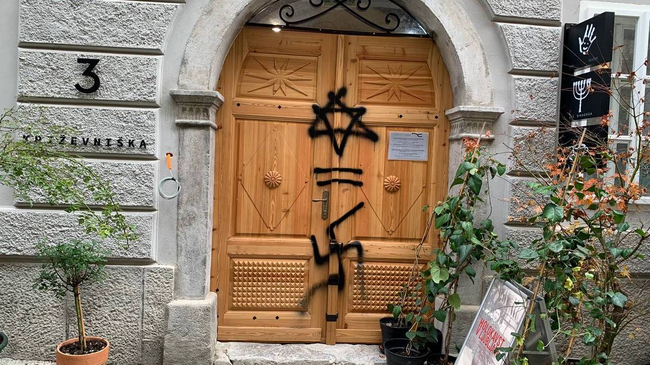 V centru Ljubljane je včeraj zvečer prišlo do kaznivega dejanja. Neznani storilec je na vrata Judovskega centra naslikal antisemitistični grafit, ki judovski simbol, Davidovo zvezdo, enači s simbolom nacistične Nemčije - svastiko.