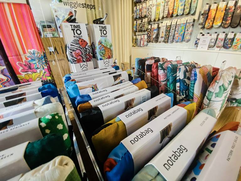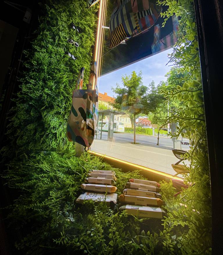 Ob vstopu v trgovino, v kateri domujejo blagovne znamke, ki jih Iva in Grega zelo pozorno izbirata, nas najprej zagotovo očara sam interier, ki se zrcali tudi že v prav posebni izložbi, oviti v zeleno rastlinje, v kateri rad drema kuža Fin, ki je postal že prava mala maskota trgovine.