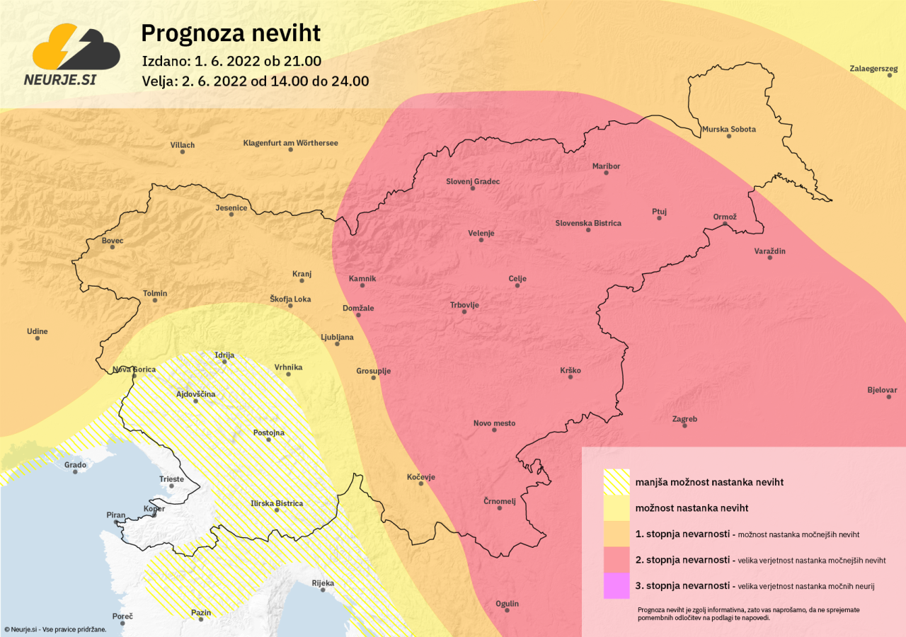 Kot so zapisali na portalu Neurje.si, so iz smeri Avstrije Koroško in del Savinjske že zajele nevihte, vmes tudi močnejše. Nevihte se krepijo in se bodo v obliki nevihtnega sistema pomikale v smeri Hrvaške. Močnejša nevihta je iz smeri severne Italije dosegla tudi območje Bovca, a slabi.