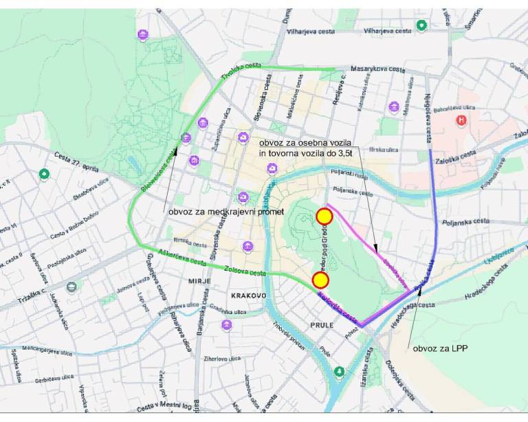 Obvoz za osebna in tovorna vozila do 3,5t bo voden po Karlovški cesti, Roški cesti in Streliški ulici in obratno.